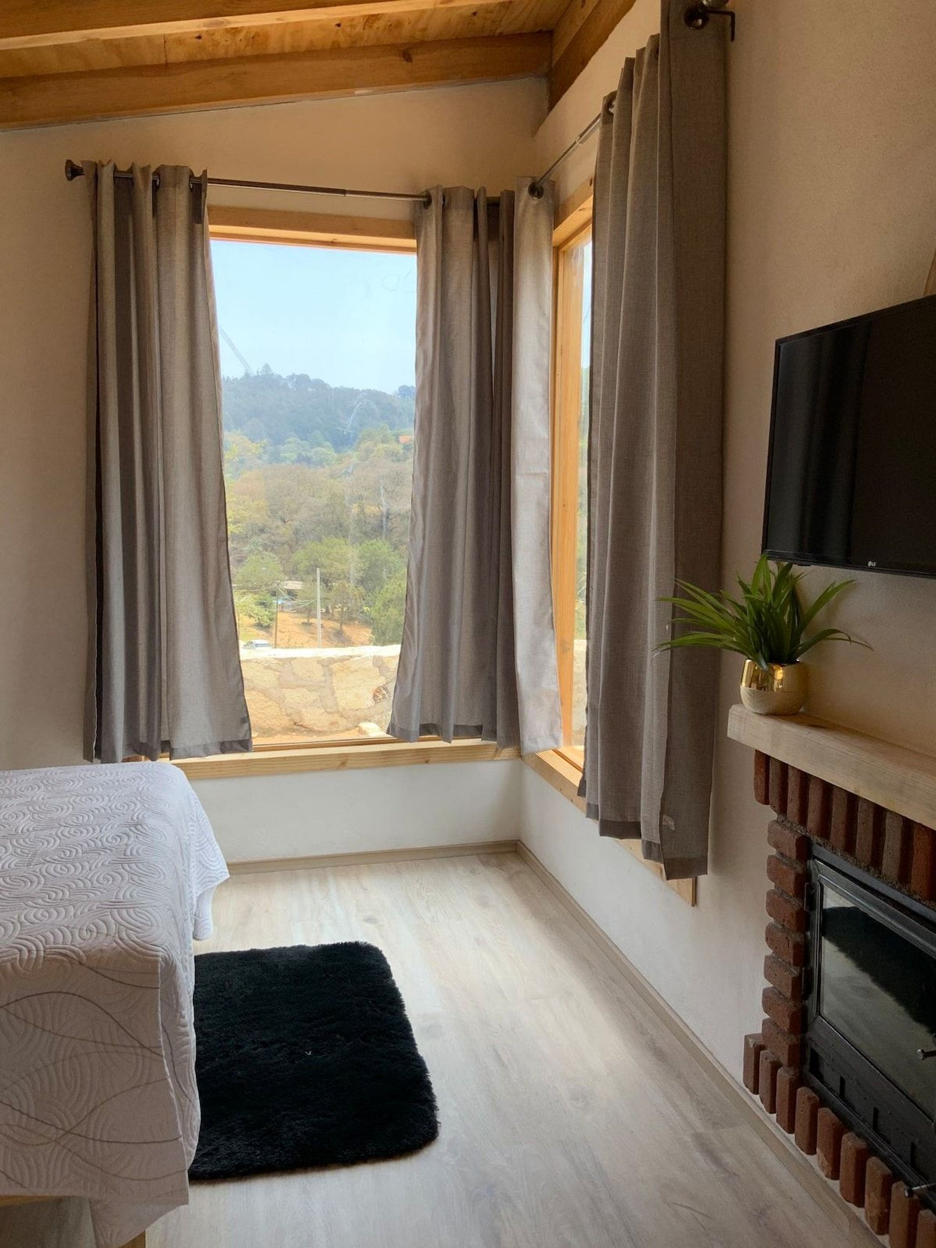 Hermosa cabaña con vistas a la montaña, pet friendly (previa solicitud) decoración única y moderna, cocina equipada, sala con chimenea, barra, baño completo, jardín cercado con asador, smart TV, WiFi fibra óptica.